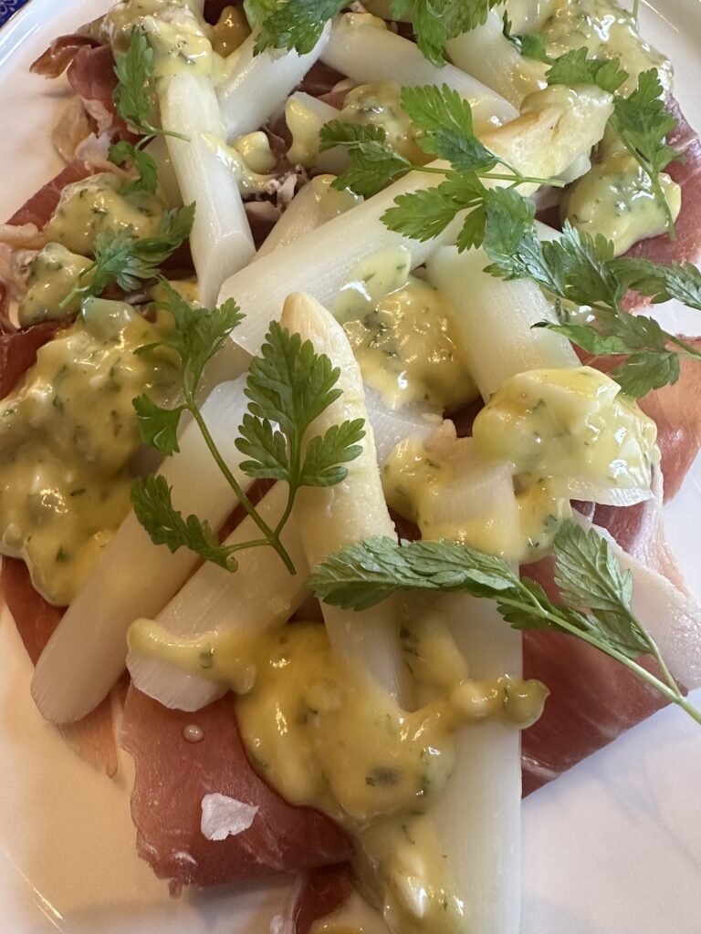 Färsk vit sparris (250g) sauce gribiche och prosciutto di San Danieli 249:-